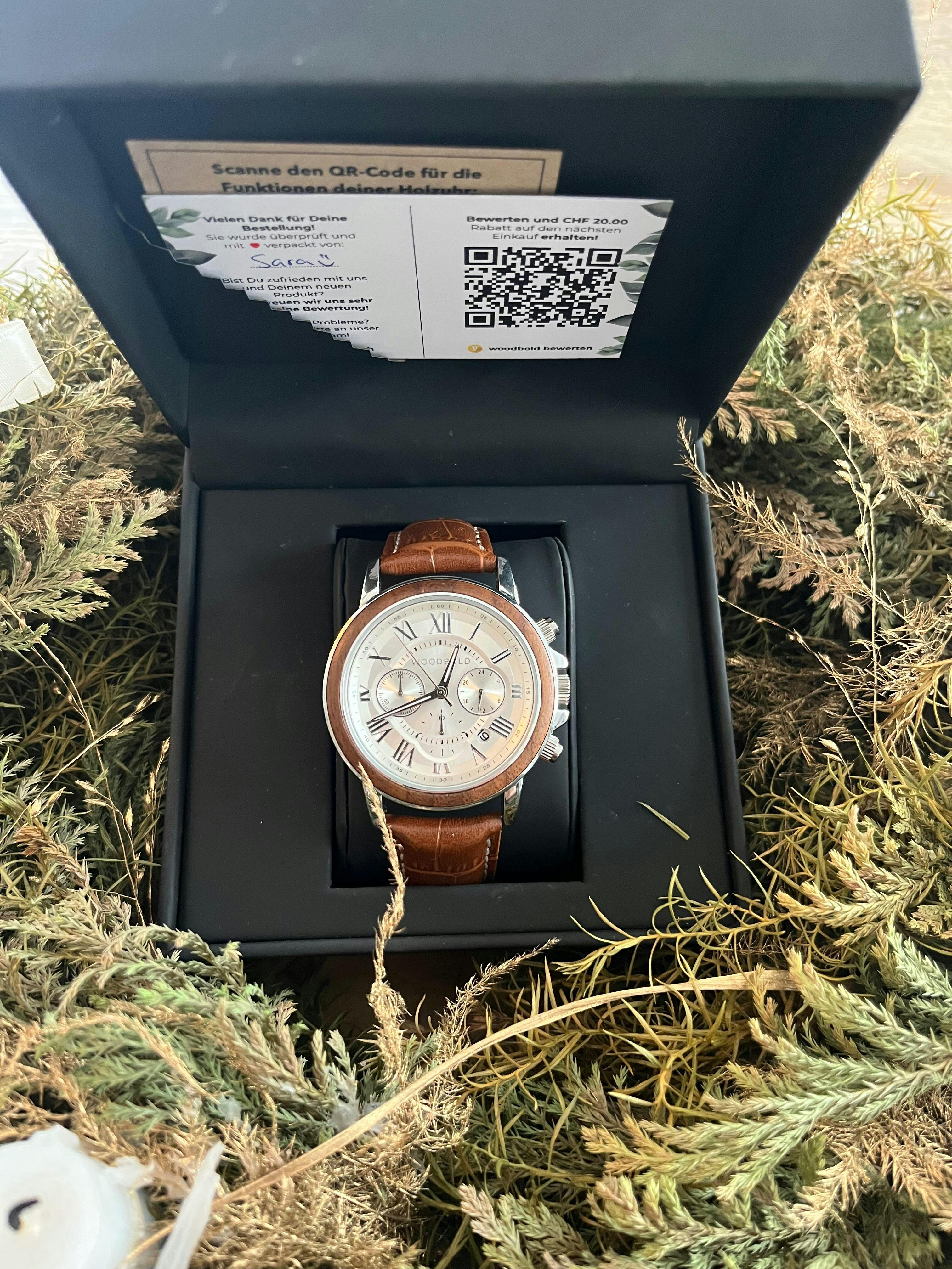 Ich habe die Holzuhr Bern gekauft und noch ein Holzstift dazu erhalten.. beide Produkte sind wunderschön verarbeitet und machen freude. Die Uhr ist leicht und angenehm zu tragen dazu sieht sie echt edel aus.. ein Hingucker zum verlieben. Bei rinem Business Anlass macht Mann eine gute Figur.